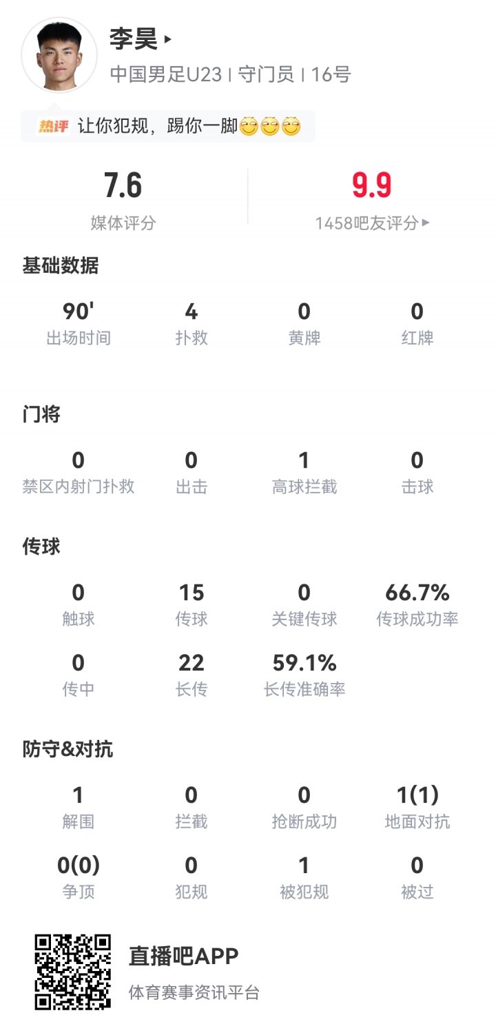 本场比赛,此前发挥出色的门将李昊没有得到太多表现机会,对手4次射正均被李昊化解,这也是这届赛事李昊最“清闲”的一场比赛。